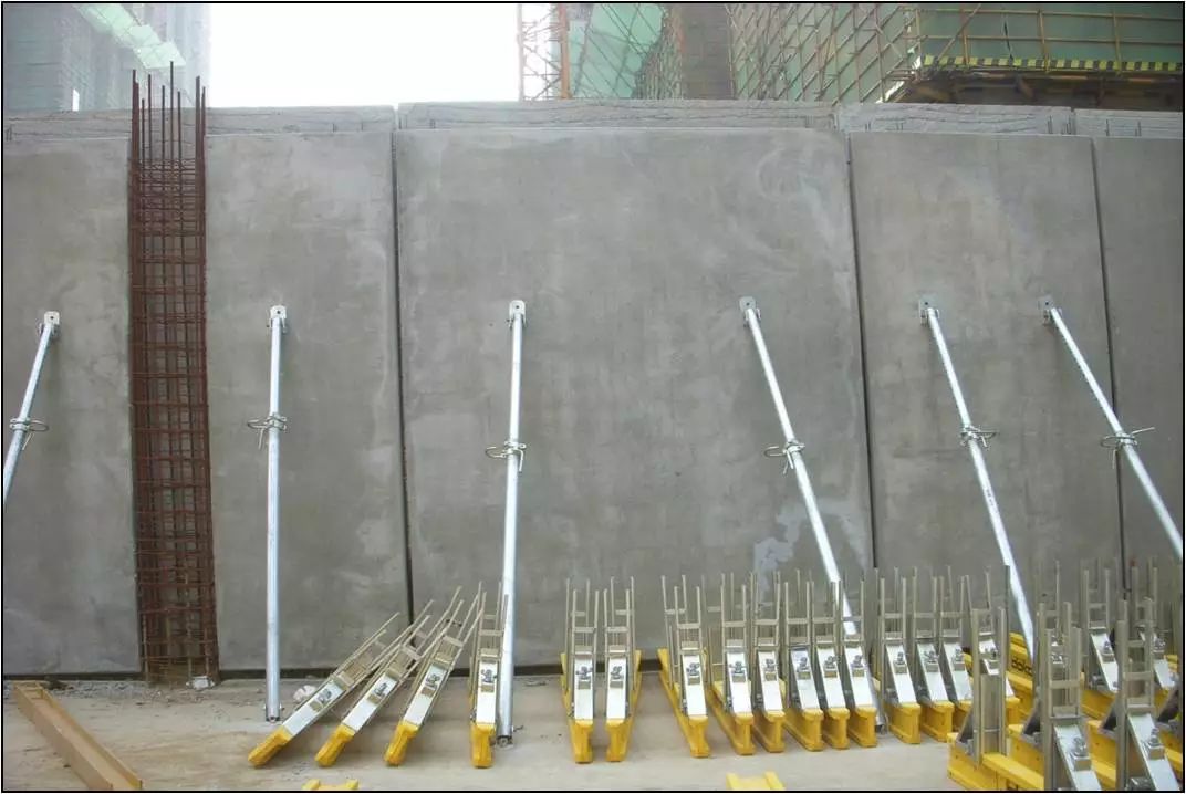 叠合墙板应按要求进行吊装,每块墙板用两根斜支撑固定和调整。