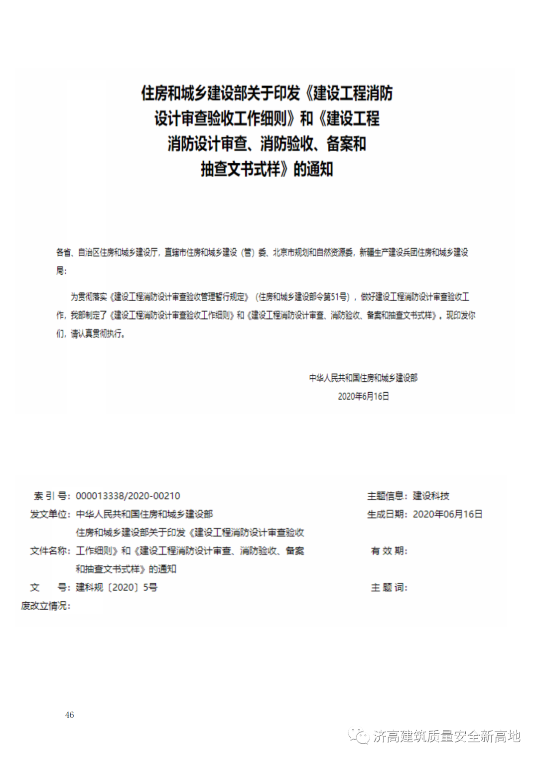 5、住房和城乡建设部关于印发《建设工程消防设计审查验收工作细则》和《建设工程消防设计审查、消防验收、备案和抽查文书样式》的通知建科规【2020】5号 第46页